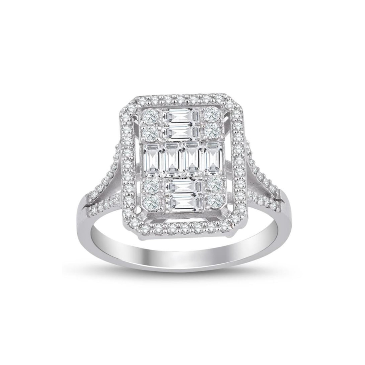 The 0.86 Carat Baguette and Diamond Ring model is approximately 3.60 grams in weight and is crafted using 18 Ct. white gold.
